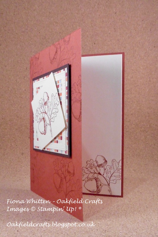 - Start with a Cajun Craze cardbase (21.0 x 14.9 cm, then score and fold at 10.5 cm) and using the acorn stamp, stamp over it in Cajun Craze ink.