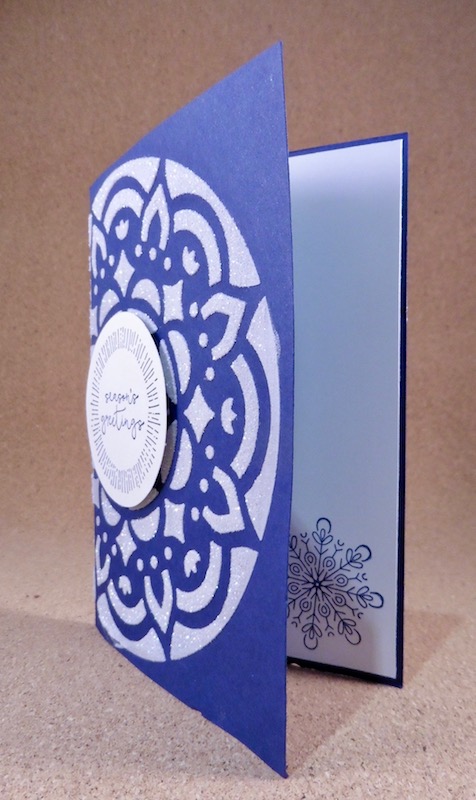 The Night of Navy cardstock had the embossing paste spread over it though the large medallion from the Pattern Party Decorative Masks and then Dazzling Diamond Glitter was sprinkled over it before the paste had a chance to dry.
