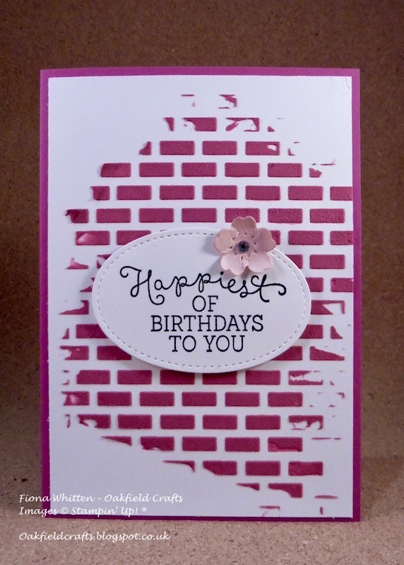 I mixed a little of the Embossing Paste with a couple of drops of Berry Burst ink refill. When completely mixed, the paste was spread across the Whisper White cardstock through the brickwork mask from the Pattern Party Decorative Masks. I didn’t want to cover the whole of the card front so I was deliberately random as to where I spread the paste.