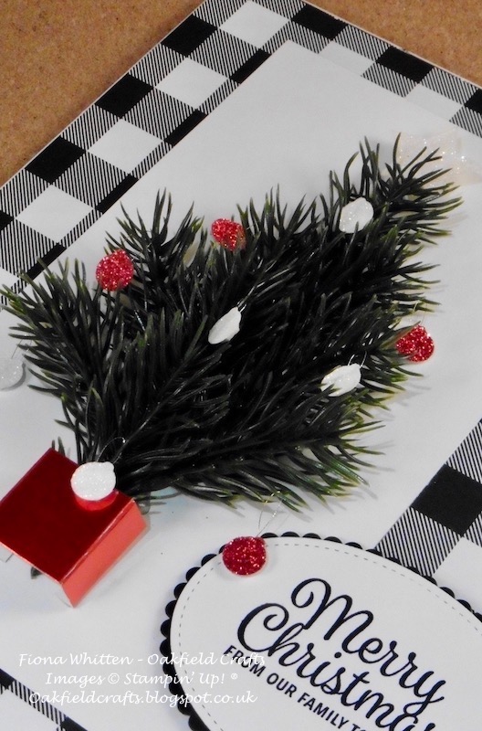 The tree itself is made from 9 Green Sprigs (they come as a box of 12) and some paper from the Merry Little Christmas Designer Series Paper for the chequered background. I used some scraps to make the ornaments and also the base around the tree. It was only when I was writing the instructions that I realised that I used some retired Real Red Foil paper.