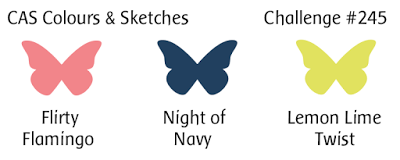 The cardbase is Night of Navy and I used another piece of Whisper White cardstock for the inside. Both the envelope and the card insert where stamped in Flirty Flamingo ink.