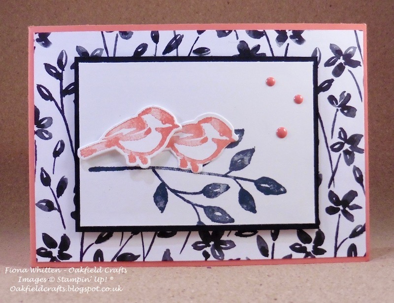 I used a Calypso Coral card base and kept my colour scheme very simple by using just Calypso Coral ink along with Tuxedo Black (Memento ink). The little enamel dots come from the Subtles Enamel Shapes.