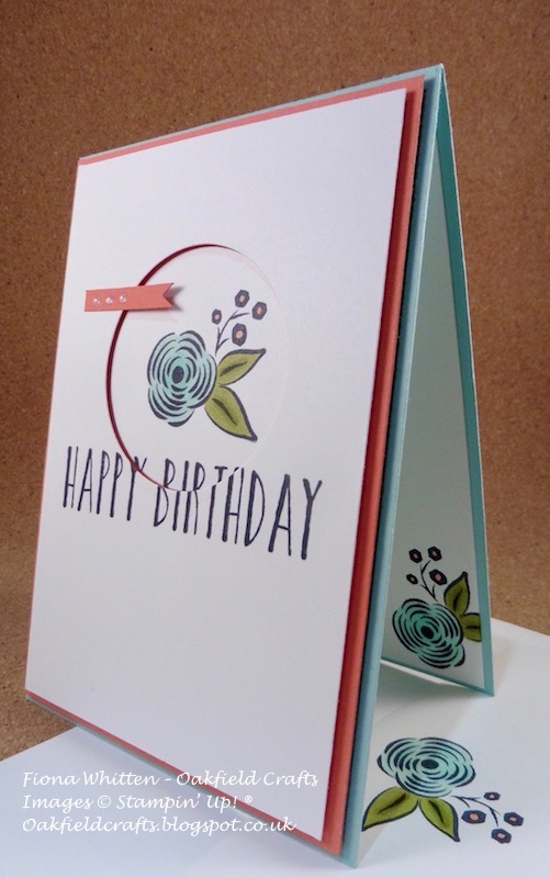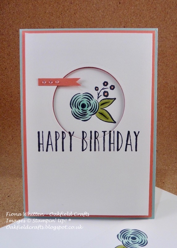 I tried to think a little outside the box this week and as you can see, I’ve cut around the flower and through the sentiment with a circle die. The circle is glued to the Calypso Coral layer beneath, and then the rest of the Whisper White layer is popped up on Stampin’ Dimensionals.