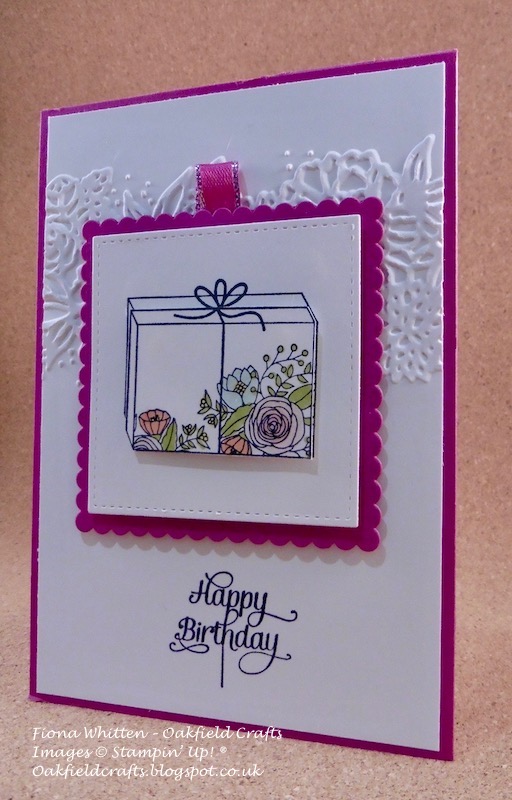 I then added the fussy cut/coloured image to the front using Stampin’ Dimensionals. The final touch is a piece of the Berry Burst Metallic Edged Ribbon which I folded over and adhered to the back of the Berry Burst Scallop Square.