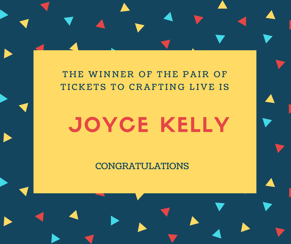 Congratulations to Joyce Kelly who has won the pair of tickets to the Crafting Live Show this coming weekend over at the Sandown Park Racecourse, Esher.