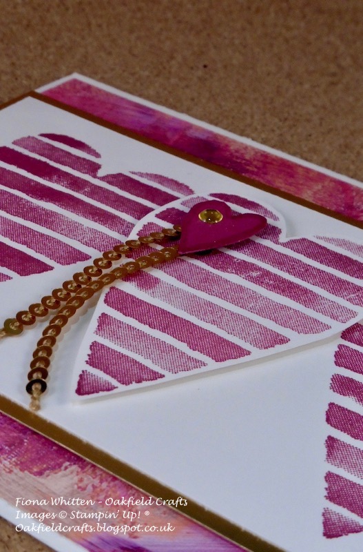 I accented the little heart with some Clear Wink of Stella, Gold Mini Sequins and a gold dot from the Metallic Enamel Shapes before adding it to the larger die cut heart using Stampin’ Dimensionals. The heart was then adhered to the card front using some more Stampin’ Dimensionals.